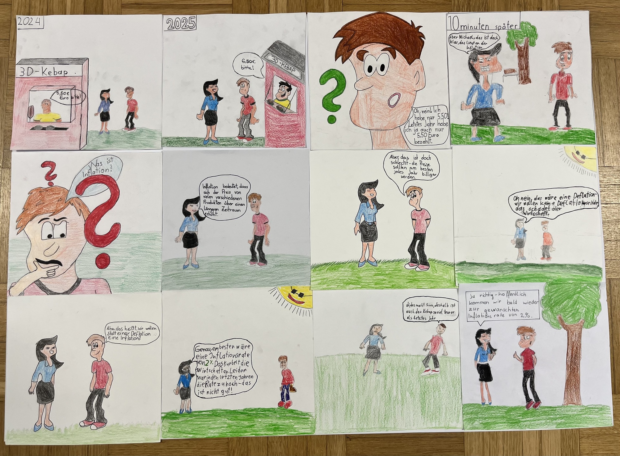 Dabei arbeiteten alle aktiv mit: Jeweils zwei Schüler:innen entwickelten eine eigene Comic-Kachel. Am Ende wurden alle Teile zu einer zusammenhängenden Geschichte verbunden. So entstand ein vollständiger Comic, der das Thema Inflation anschaulich und lebendig erklärt.