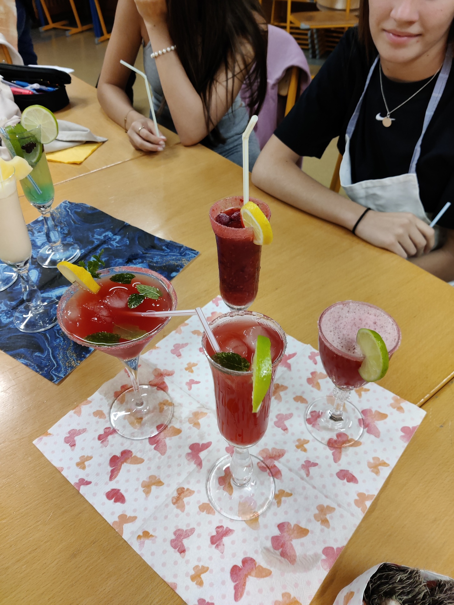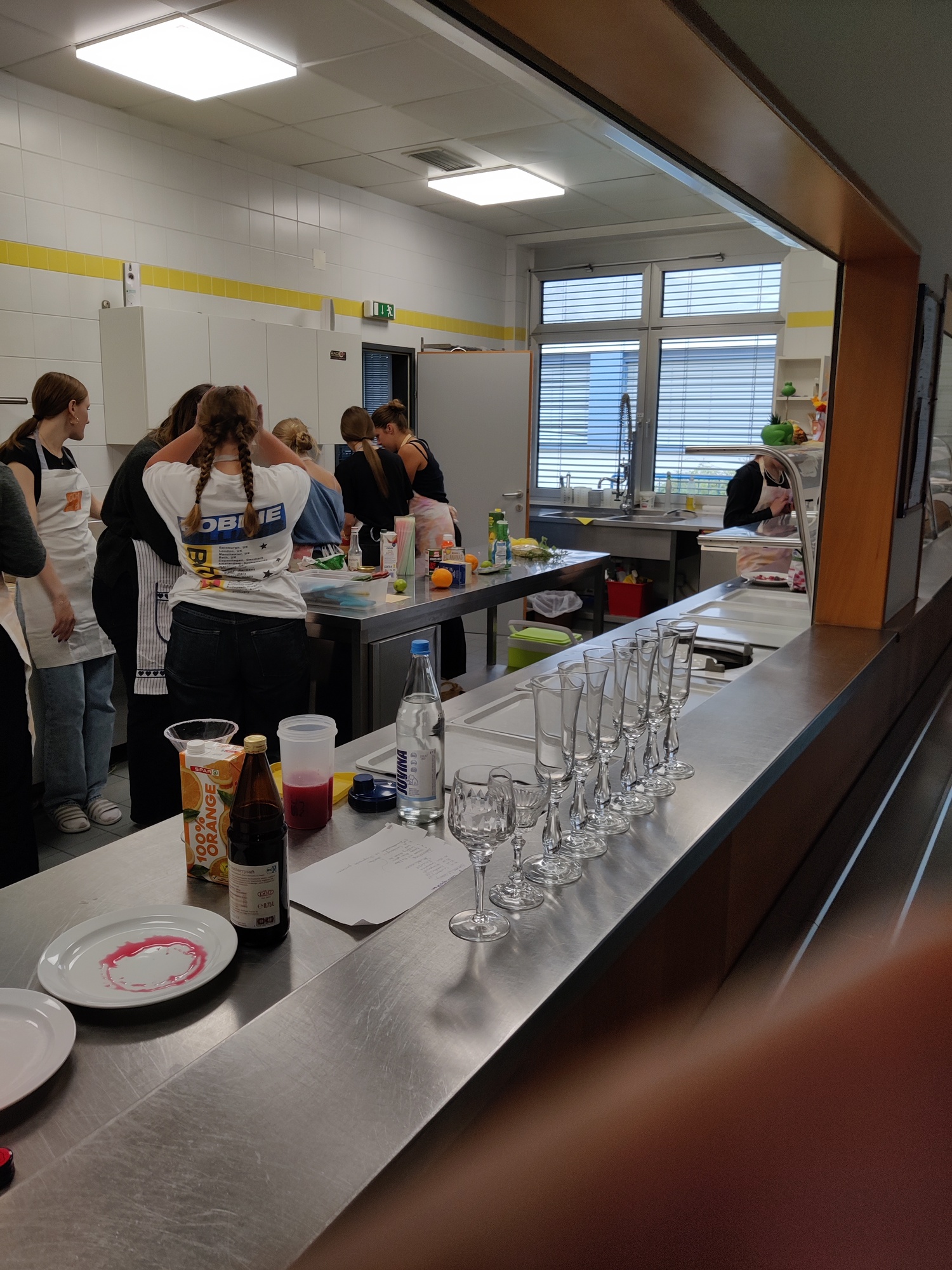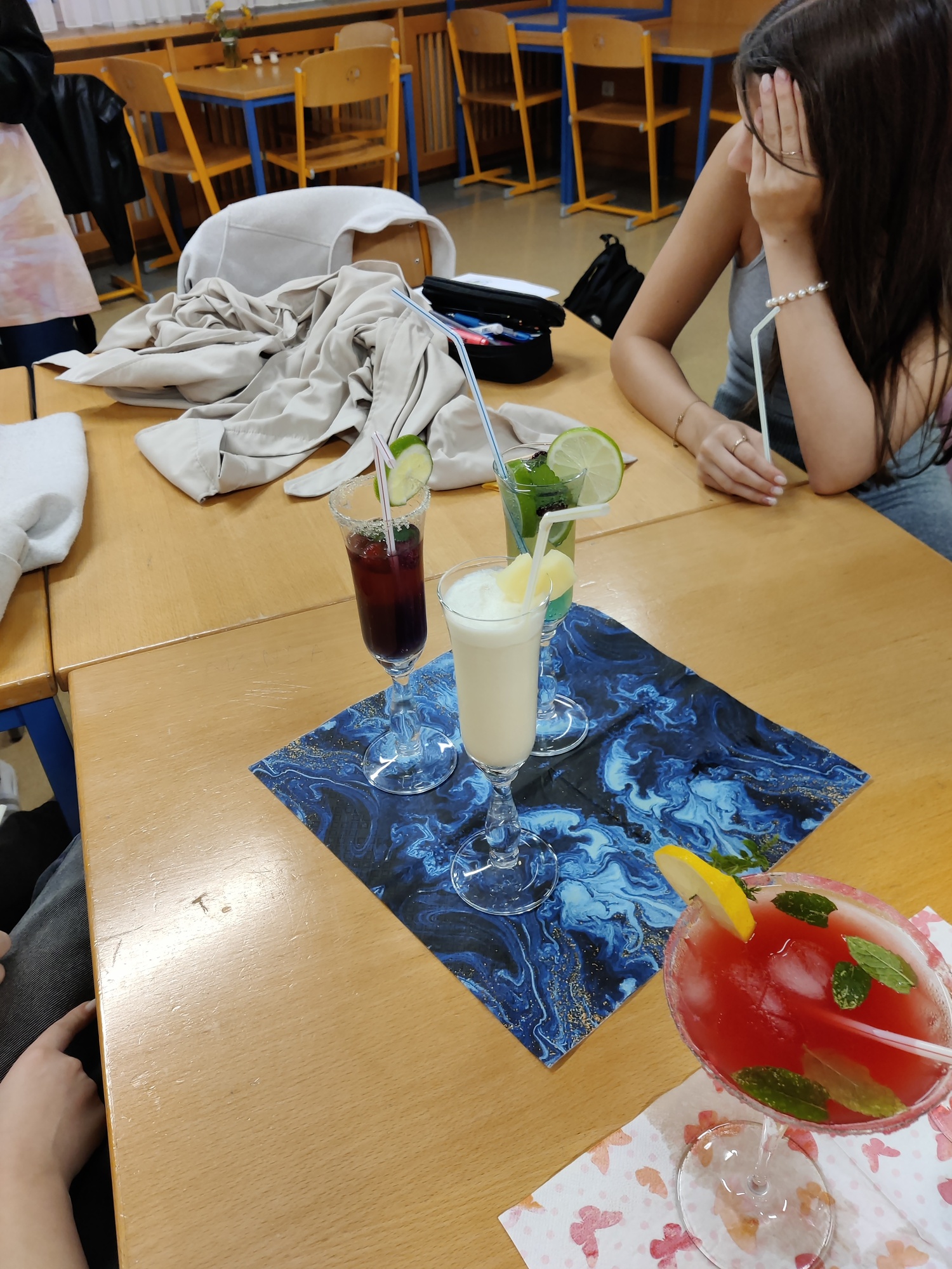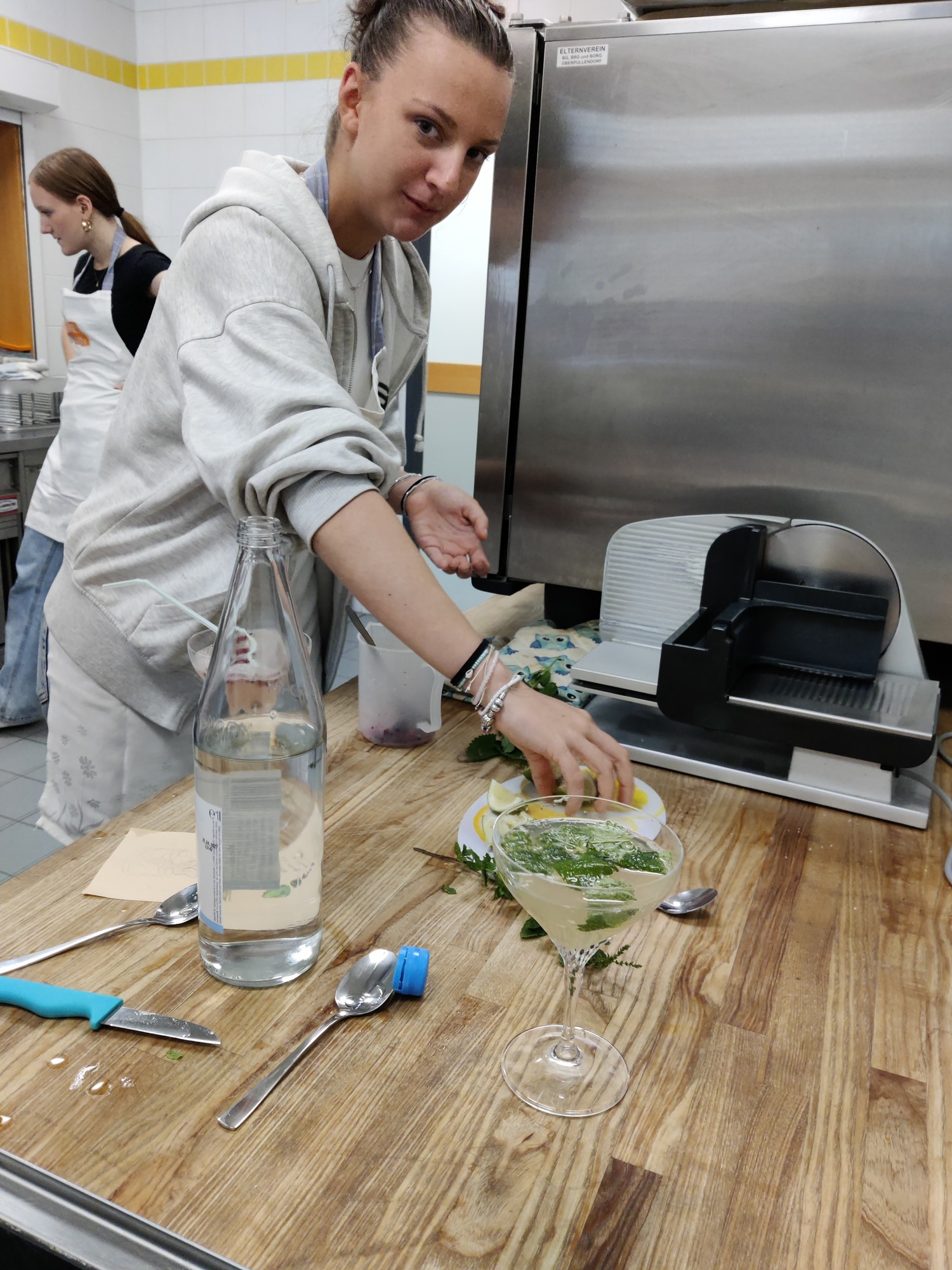 Nachdem der Maturaball 2025 erfolgreich und feucht-fröhlich zu Ende ging, gab's im Unterrichtsfach „Haushaltsökonomie und Ernährung" Cocktails „mit ohne Alkohol", sogenannte Mocktails. Die Schülerinnen der 7AF mixten nach Rezepten und kreierten eigene Getränke – „Virgin Mojito", „Virgin Colada", „Paradise kiss", „Bluerry blossom", etc. Sie sahen toll aus und schmeckten und verfehlten ihre Wirkung nicht; die Damen hatten großen Spaß an der Sache. Also: Es geht auch ohne!