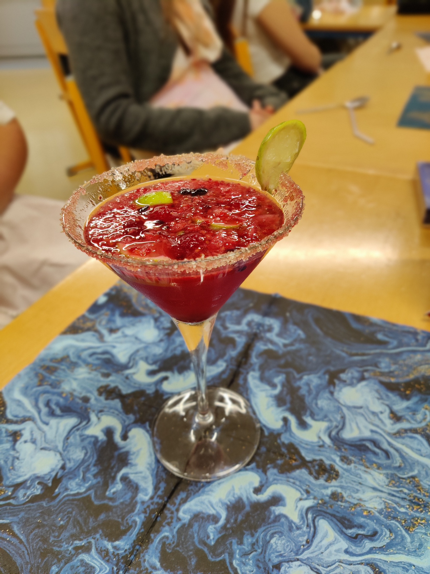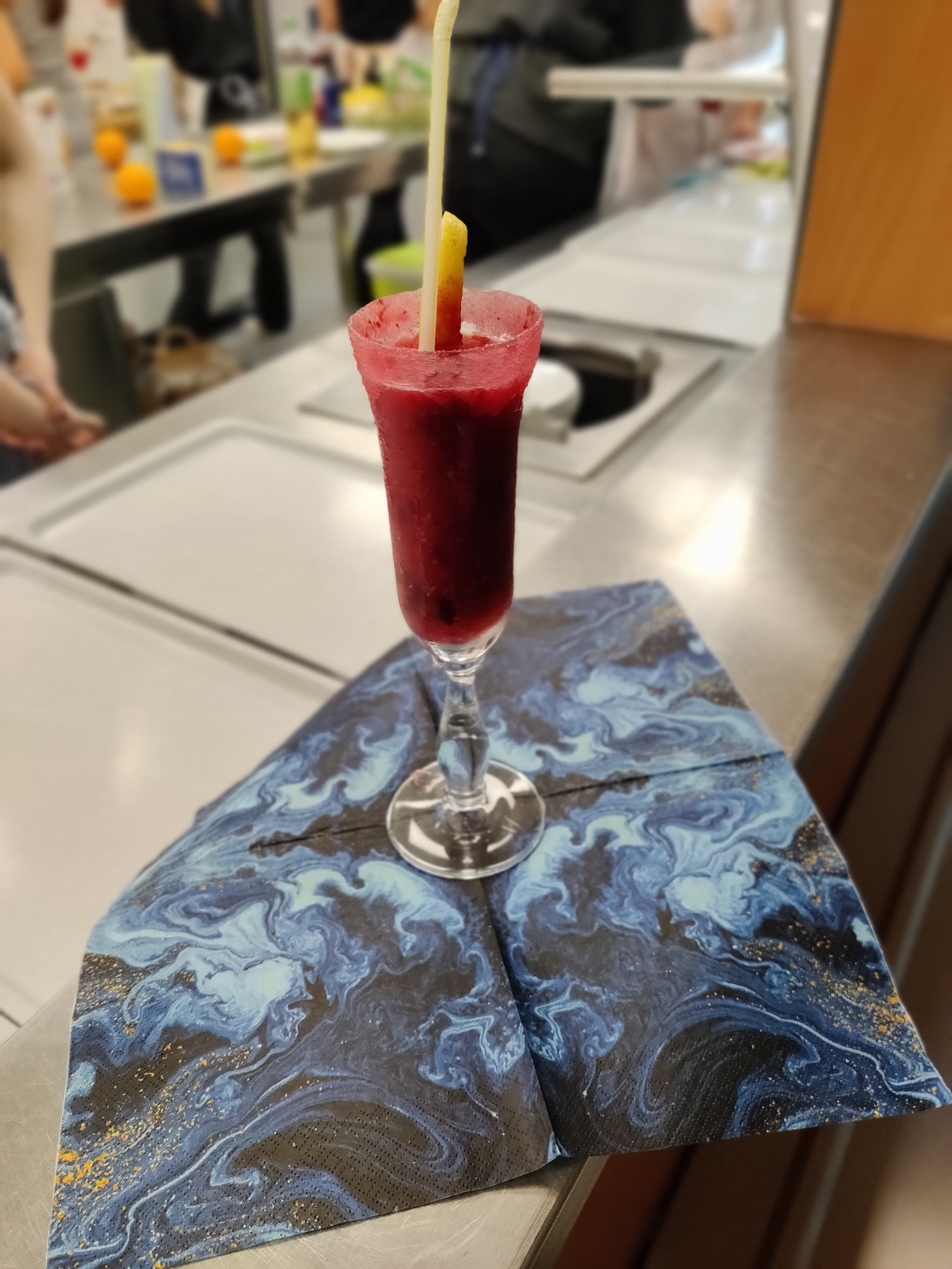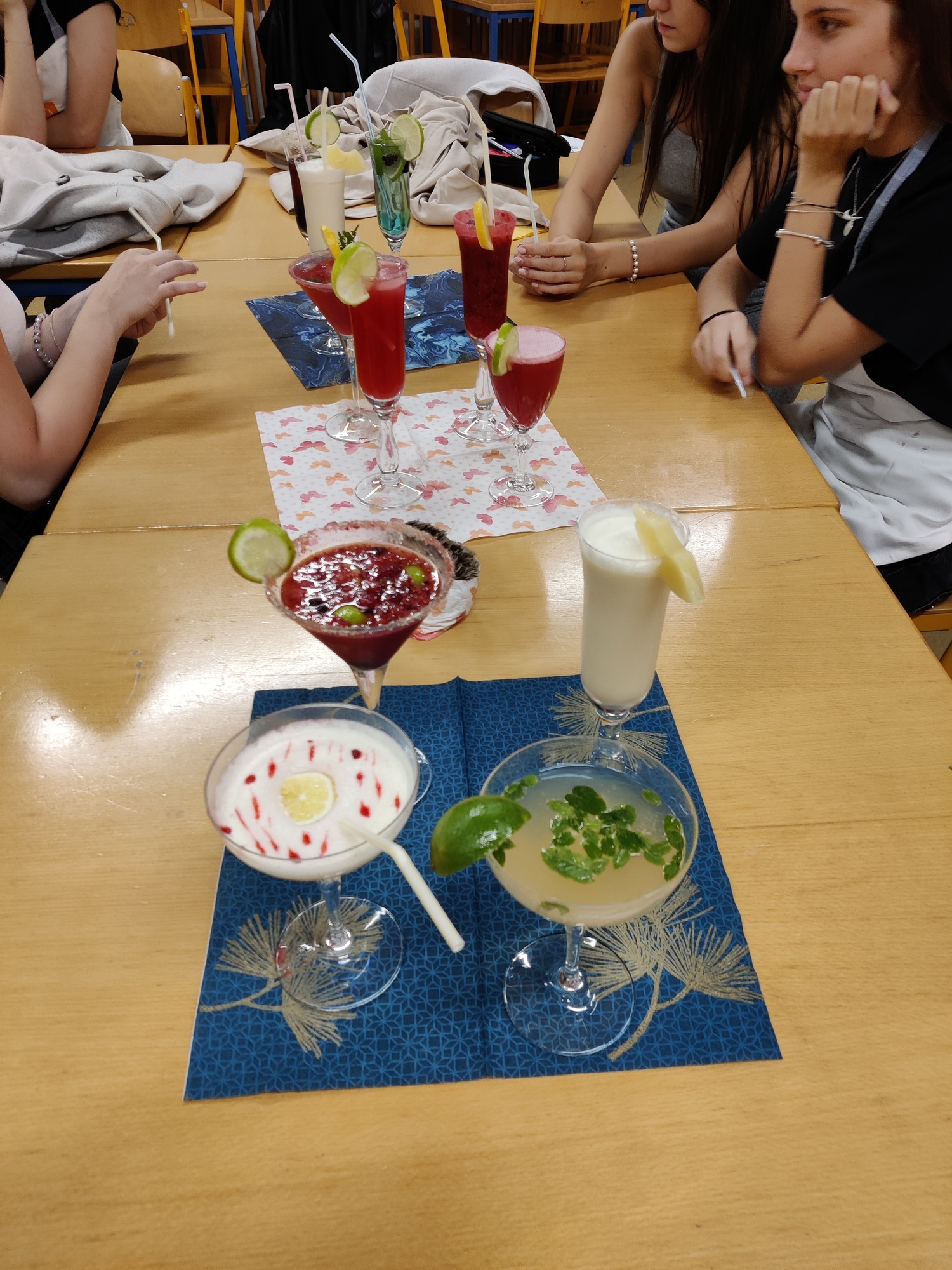Nachdem der Maturaball 2025 erfolgreich und feucht-fröhlich zu Ende ging, gab's im Unterrichtsfach „Haushaltsökonomie und Ernährung" Cocktails „mit ohne Alkohol", sogenannte Mocktails. Die Schülerinnen der 7AF mixten nach Rezepten und kreierten eigene Getränke – „Virgin Mojito", „Virgin Colada", „Paradise kiss", „Bluerry blossom", etc. Sie sahen toll aus und schmeckten und verfehlten ihre Wirkung nicht; die Damen hatten großen Spaß an der Sache. Also: Es geht auch ohne!