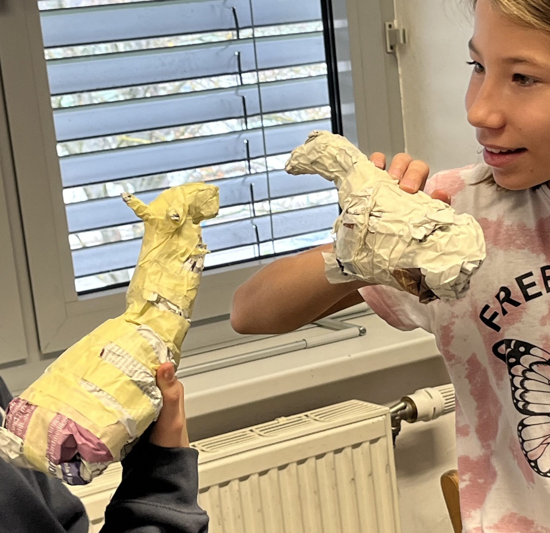 Das charakteristische Erscheinungsbild von Tieren erkennen und die Tierkörper modellieren. Erlaubt sind nur Zeitungspapier und Malerabdeckband. Naturstudien mit Schleichtieren – echte hat uns der Herr Direktor leider nicht erlaubt!