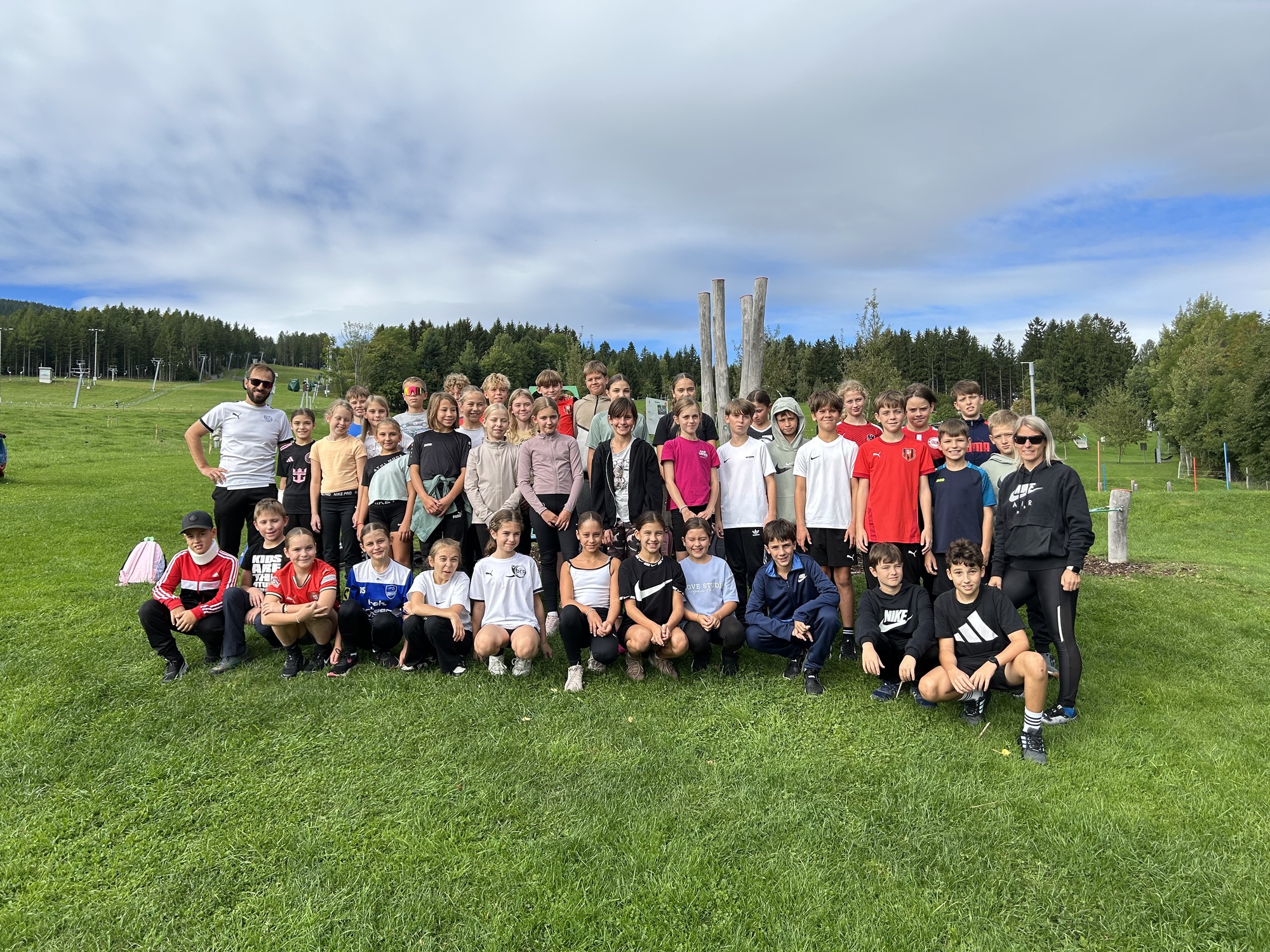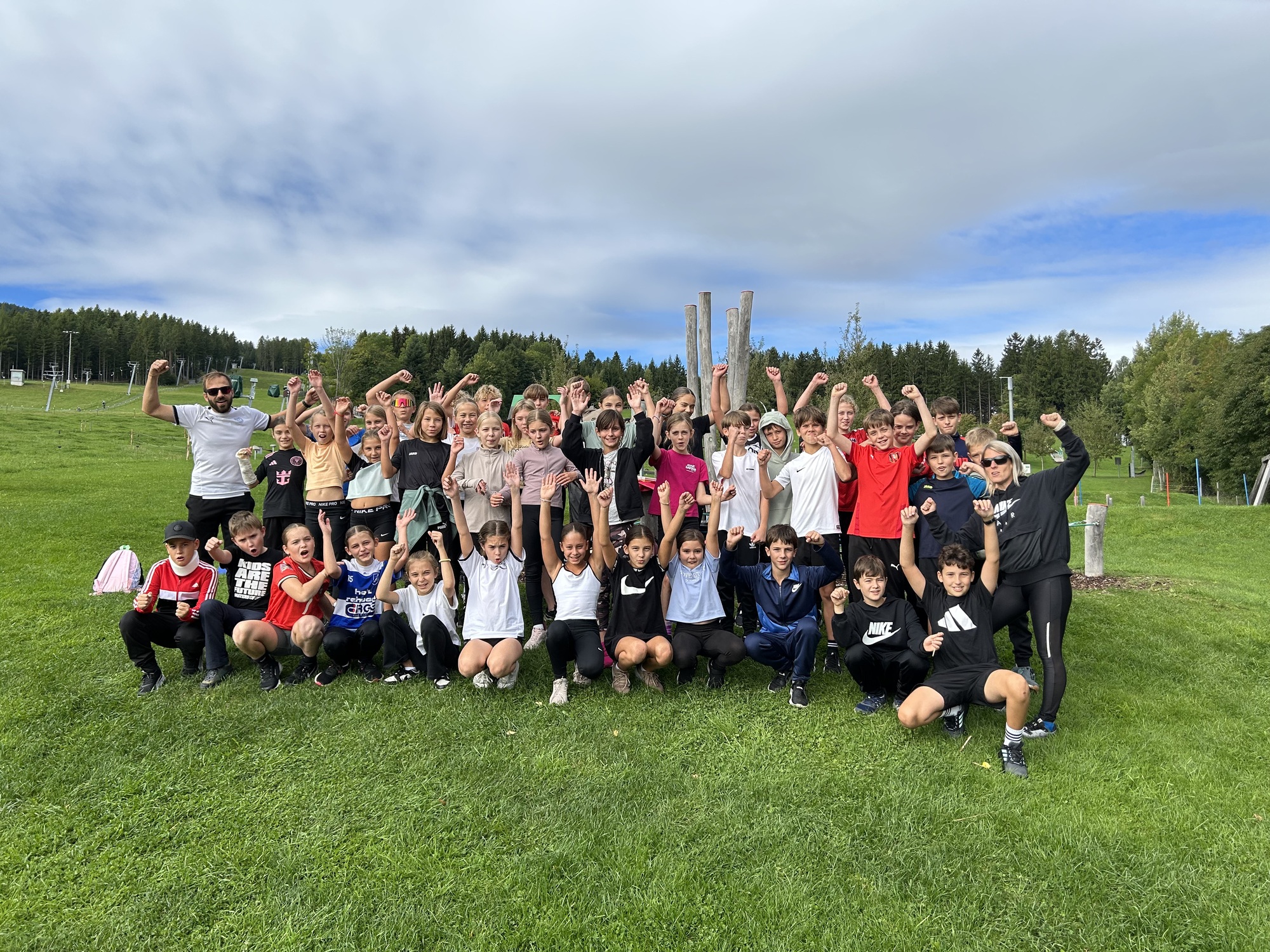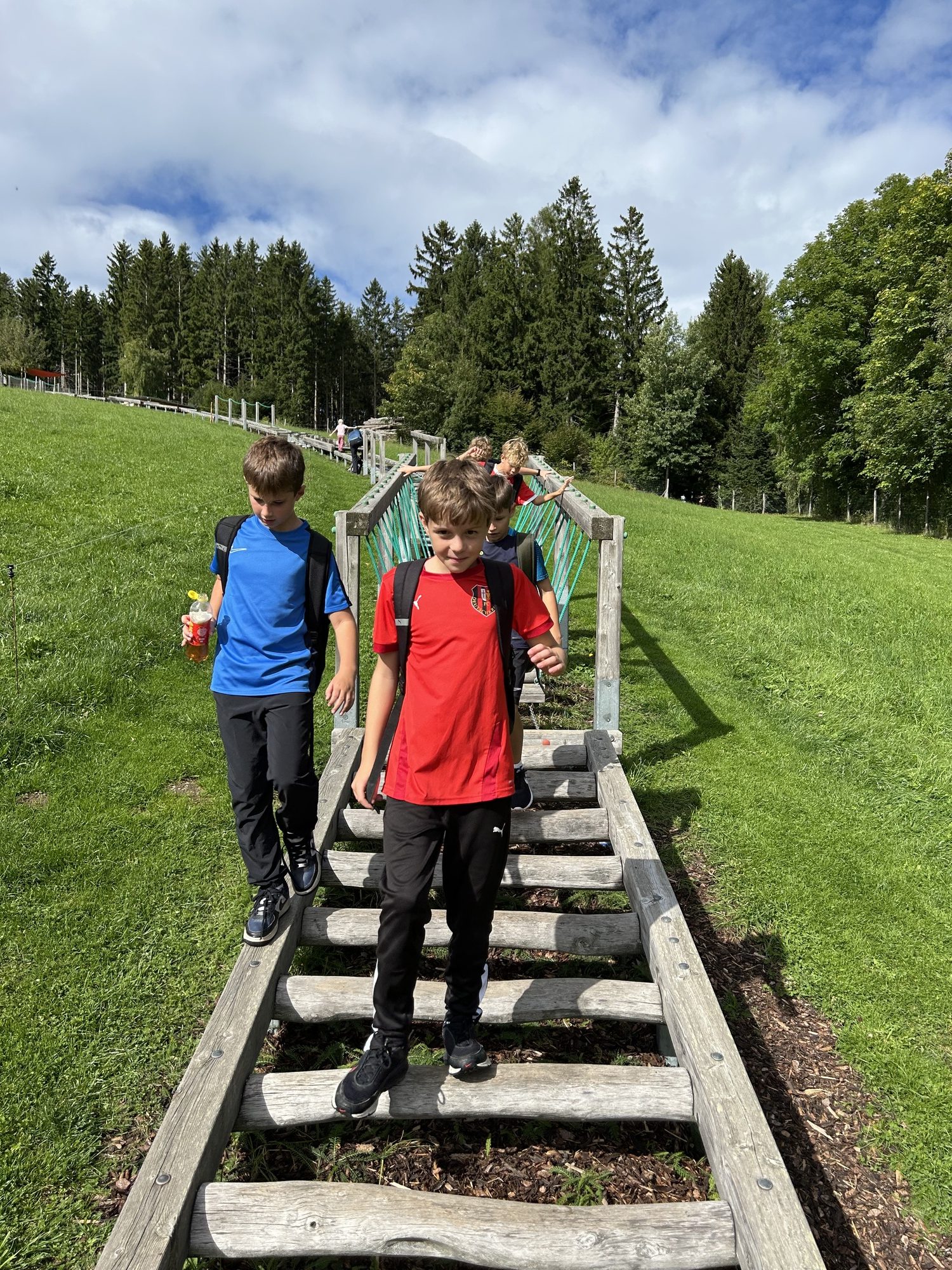 An einem herrlichen Spätsommertag machten sich die Sportklassen 1B und 2B mit ihren Begleitlehrpersonen Bauer, Hitzel und Lang2 voller Vorfreude auf den Weg nach St. Corona, um den Motorikpark der WexlArena zu erobern. Schon die Busfahrt war lautstark und fröhlich, und spätestens bei der ersten wackeligen Station merkte man: Heute würde kein Bein und kein Arm unbenutzt bleiben.