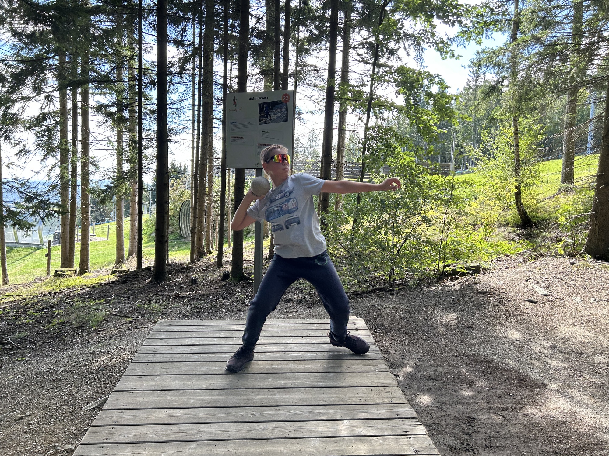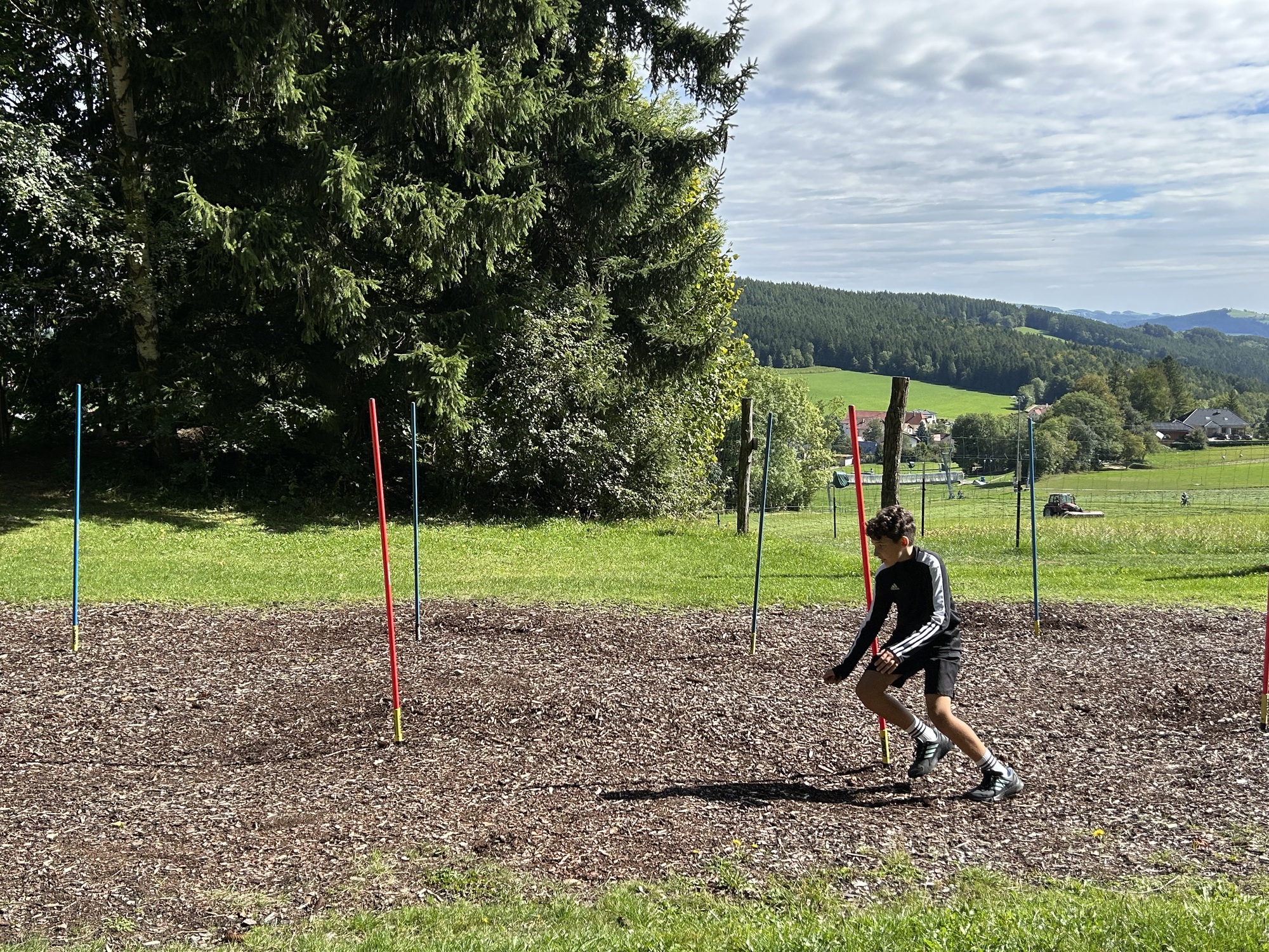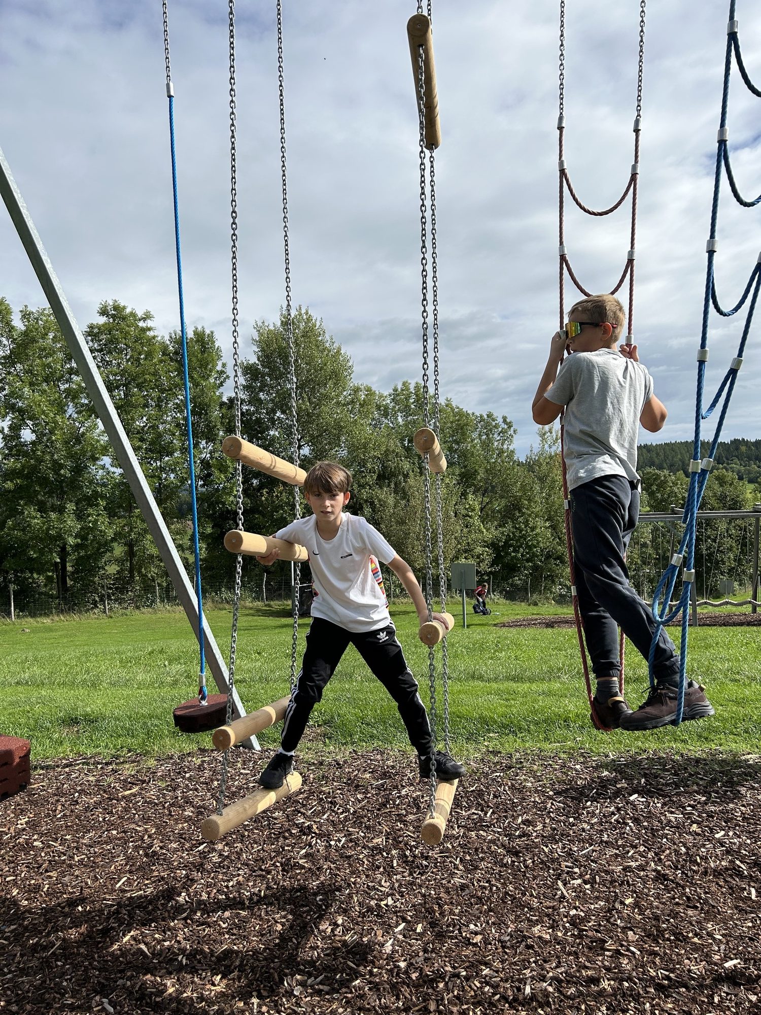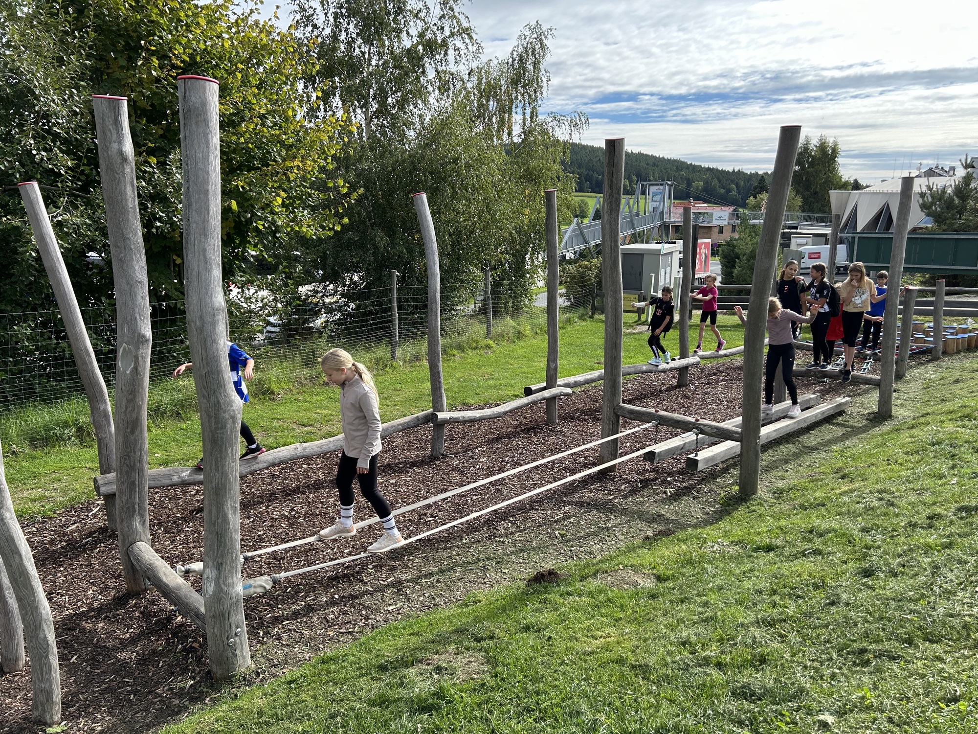 An einem herrlichen Spätsommertag machten sich die Sportklassen 1B und 2B mit ihren Begleitlehrpersonen Bauer, Hitzel und Lang2 voller Vorfreude auf den Weg nach St. Corona, um den Motorikpark der WexlArena zu erobern. Schon die Busfahrt war lautstark und fröhlich, und spätestens bei der ersten wackeligen Station merkte man: Heute würde kein Bein und kein Arm unbenutzt bleiben.