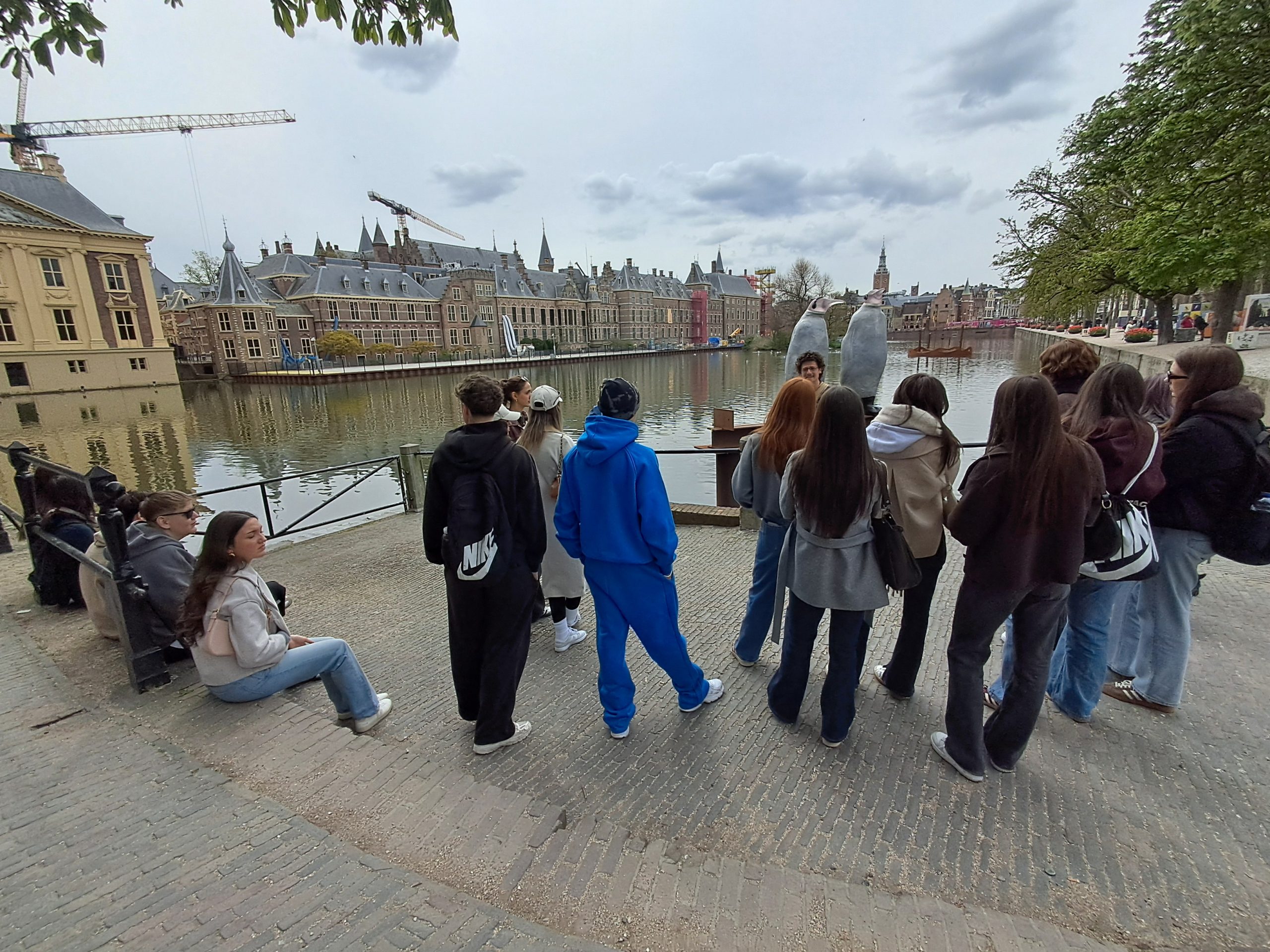 Unser erster Programmpunkt war eine Tour durch die Innenstadt Den Haags. Unser Guide Niels zeigte uns interessante Gegenden und Sehenswürdigkeiten der politischen Hauptstadt der Niederlande. Er erklärte uns einerseits einiges zur Geschichte der Monarchie und gab uns andererseits auch kulinarische Tipps, ebenso stand ein Einkaufszentrum im Stil Mailands auf der Agenda. Am Ende der Runde bestiegen wir einen Aussichtsturm und sahen Den Haag von oben.
