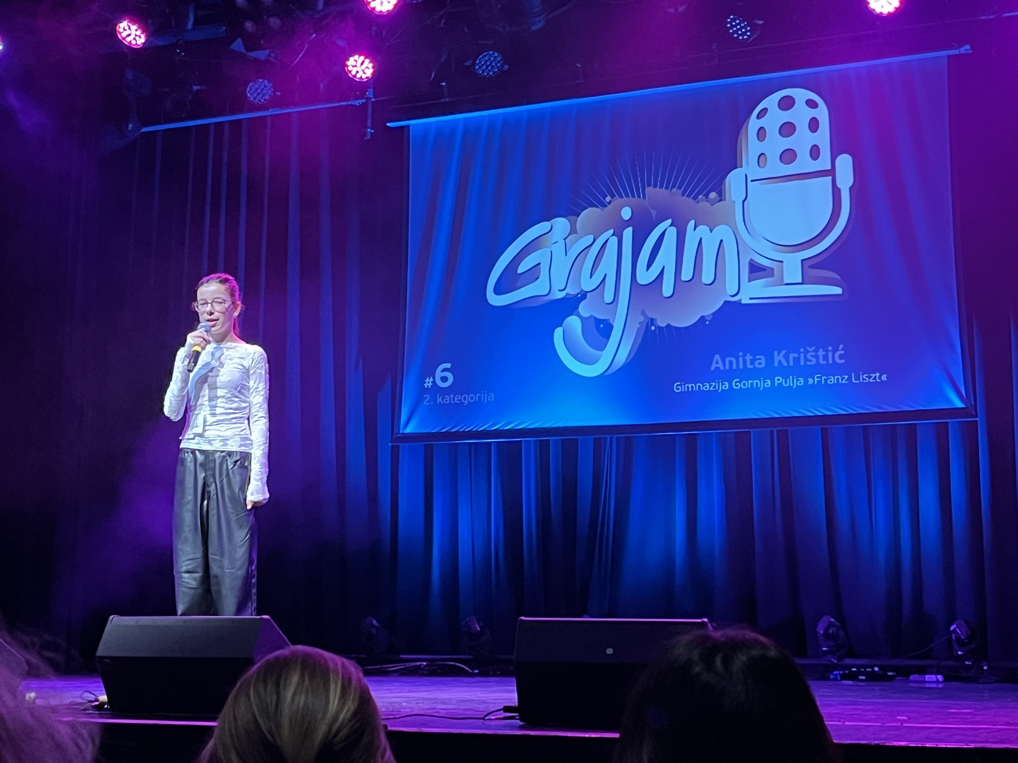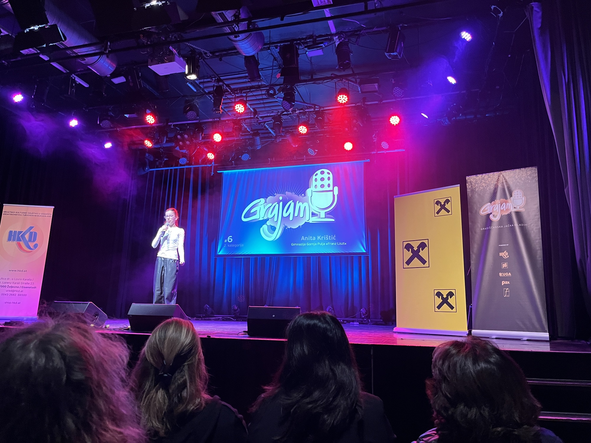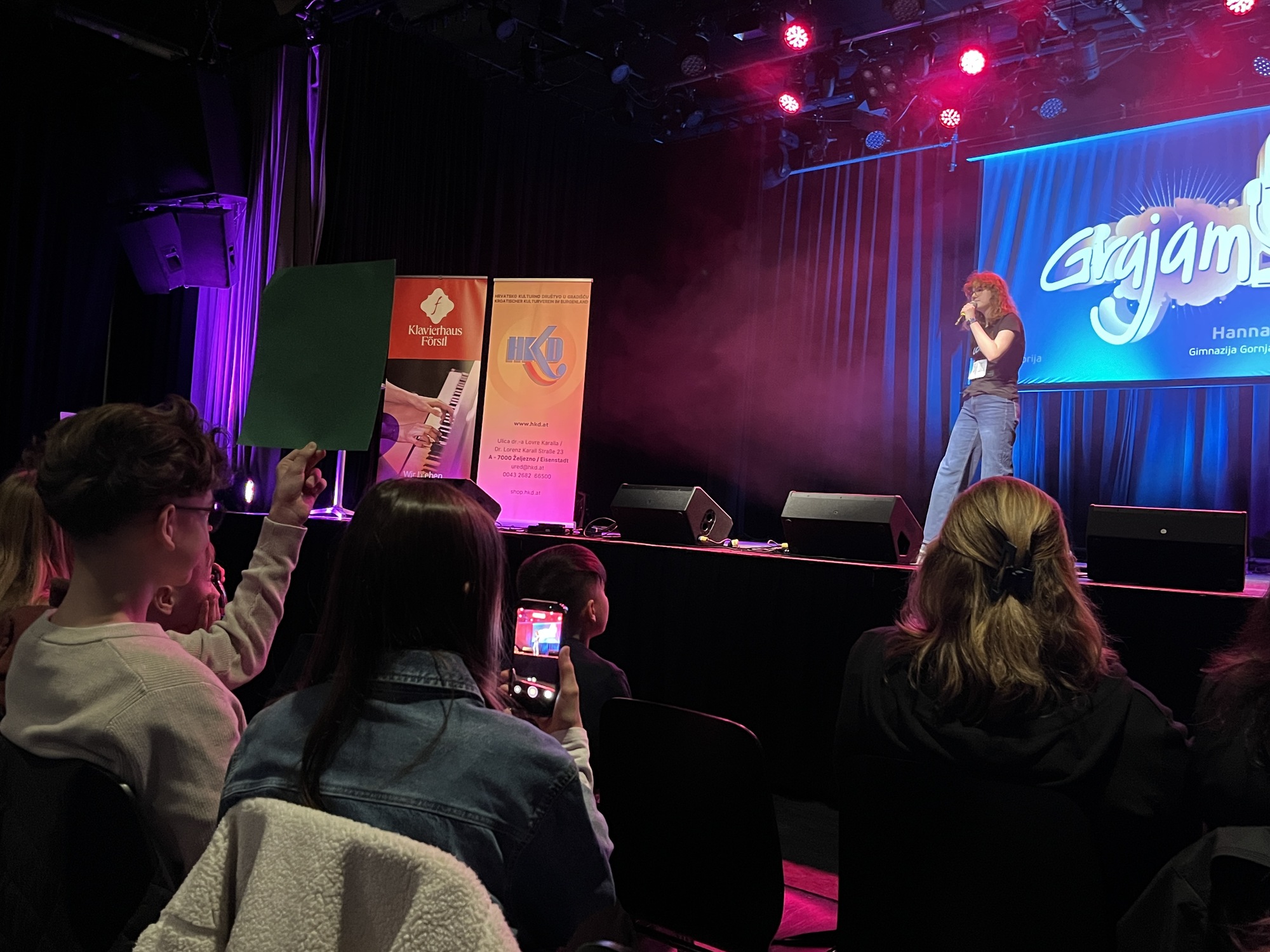 Nur Anita und Hanna aus der 2A waren mutig genug sich beim GRAJAM, dem Gesangswettbewerb des Kroatischen Kulturvereins (HKD) Gesangswettbewerb im großen KUGA-Saal zu präsentieren! Ganz professionell – mit Mikros, Scheinwerfern und jungen Publikum – vor einer dreiköpfigen Jury.