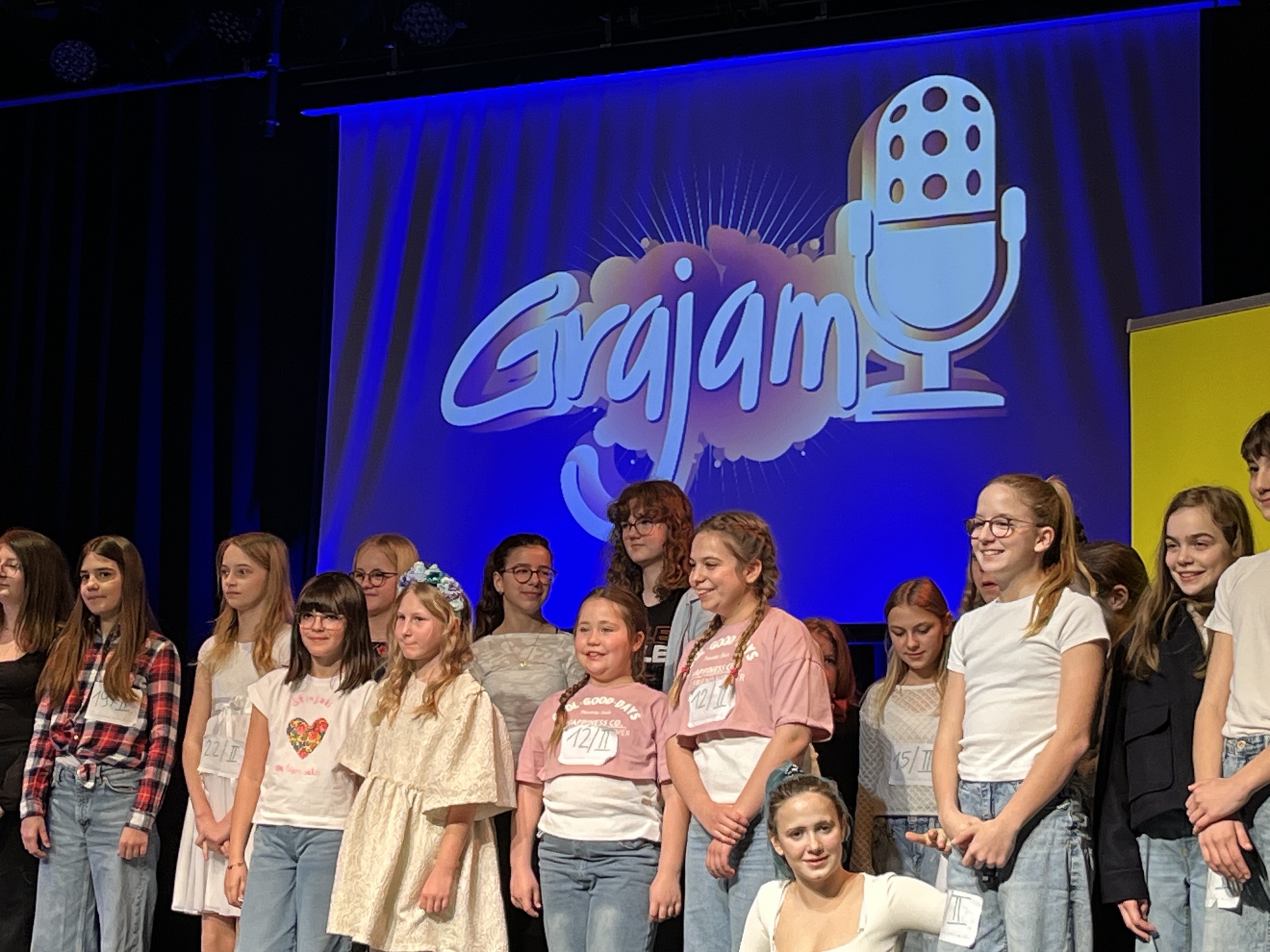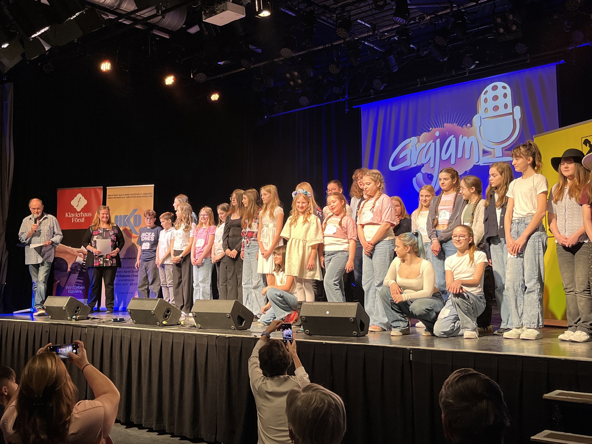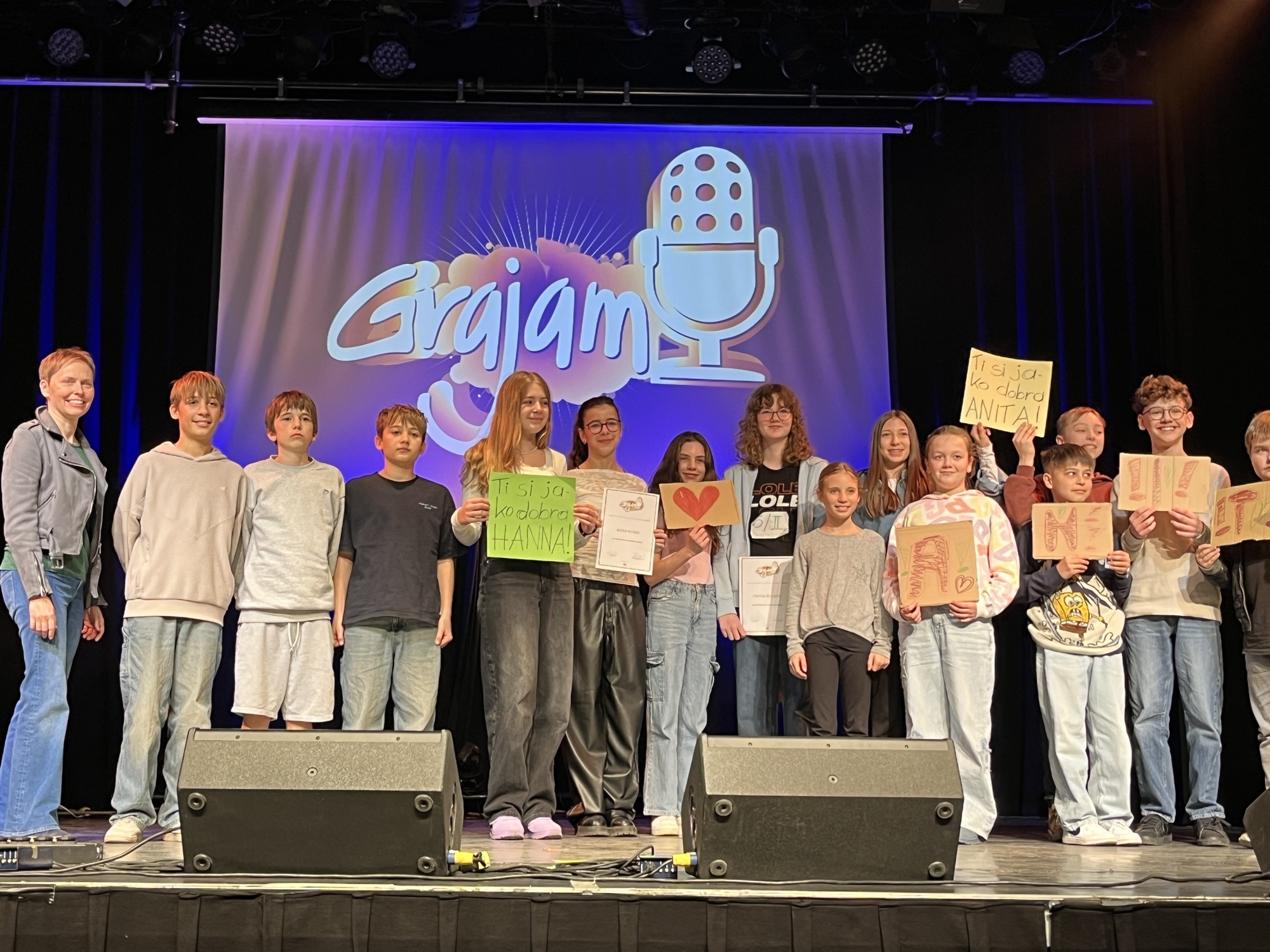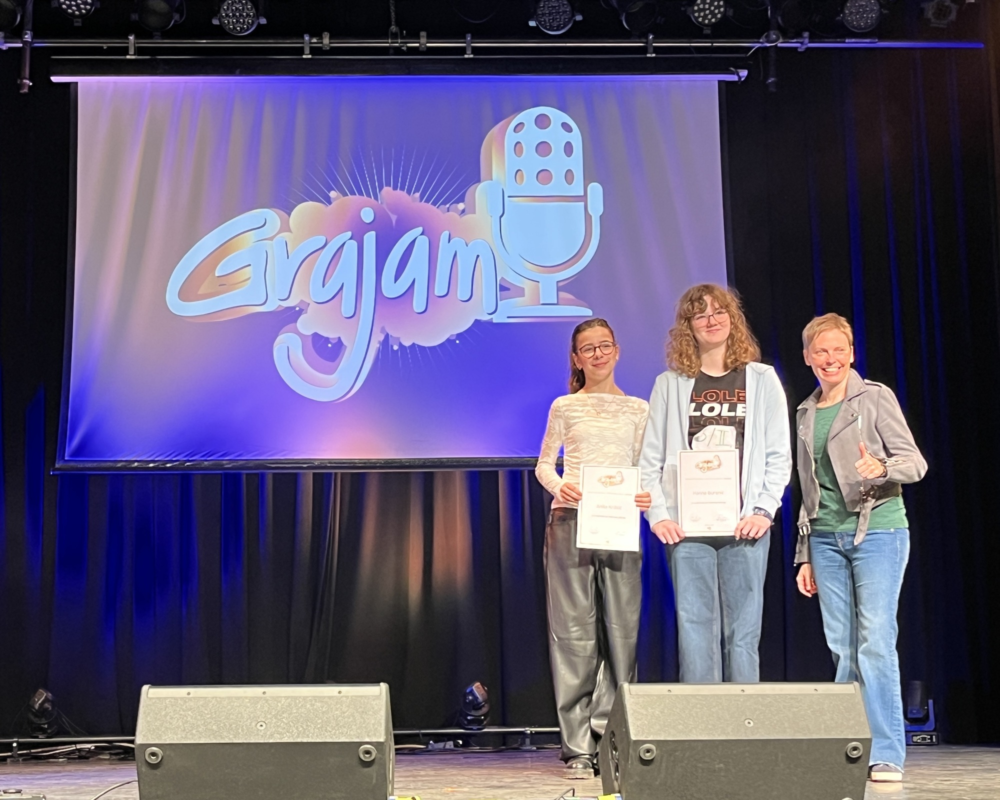 Nur Anita und Hanna aus der 2A waren mutig genug sich beim GRAJAM, dem Gesangswettbewerb des Kroatischen Kulturvereins (HKD) Gesangswettbewerb im großen KUGA-Saal zu präsentieren! Ganz professionell – mit Mikros, Scheinwerfern und jungen Publikum – vor einer dreiköpfigen Jury.