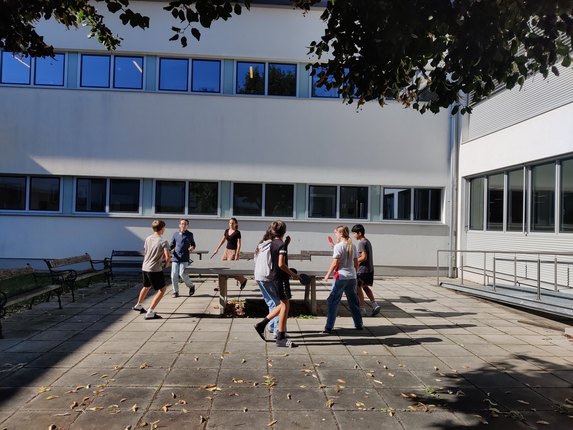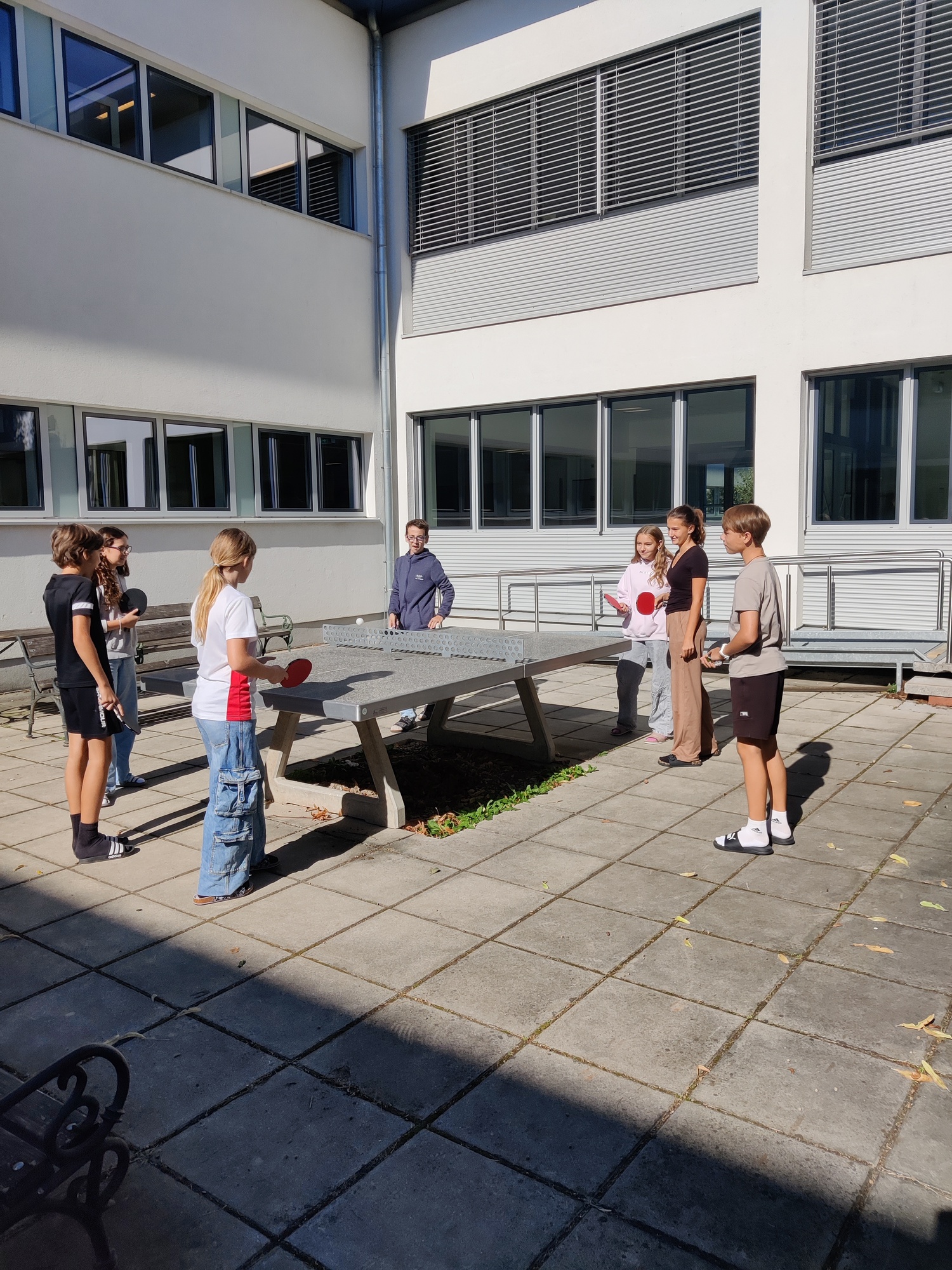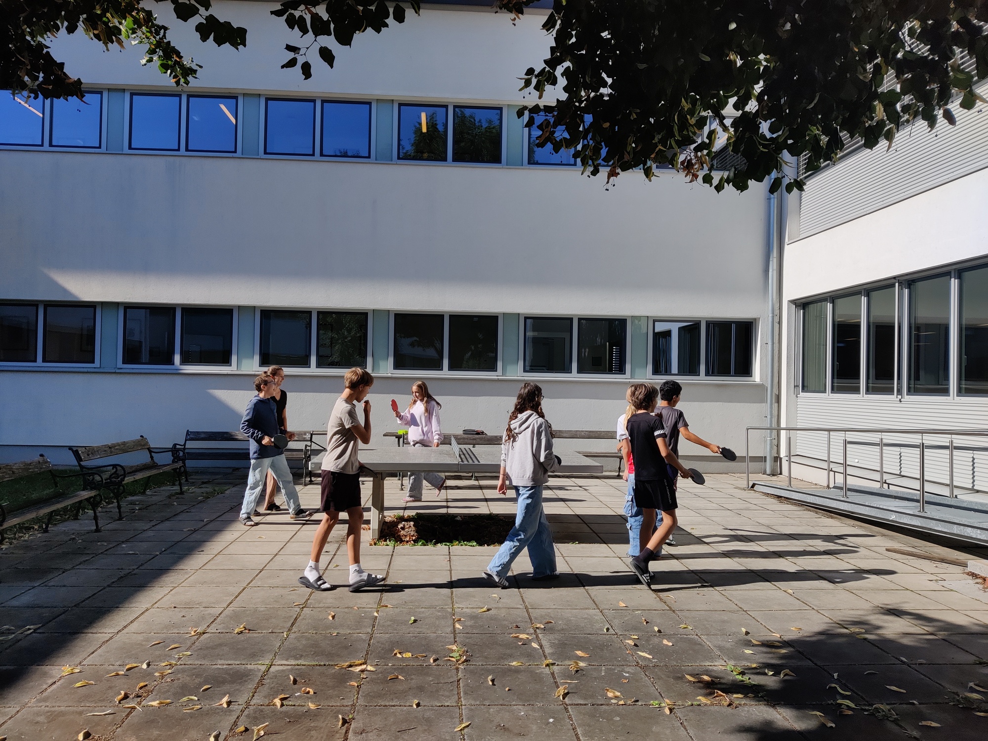 Die Schülerinnen und Schüler danken für die neuen Tischtennisschläger und -bälle – jetzt können die Pausen wieder schwungvoll genutzt werden. Und wie man sieht: Bewegung macht Spaß, und alle dürfen sich beteiligen!