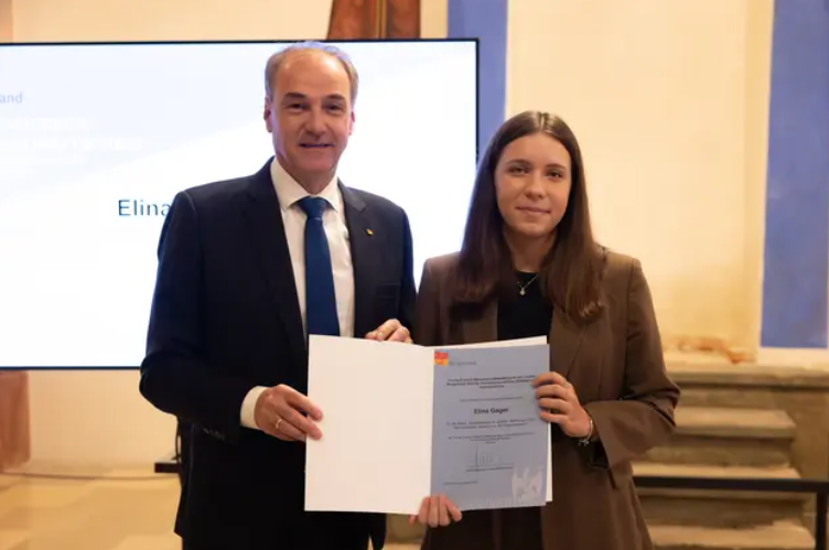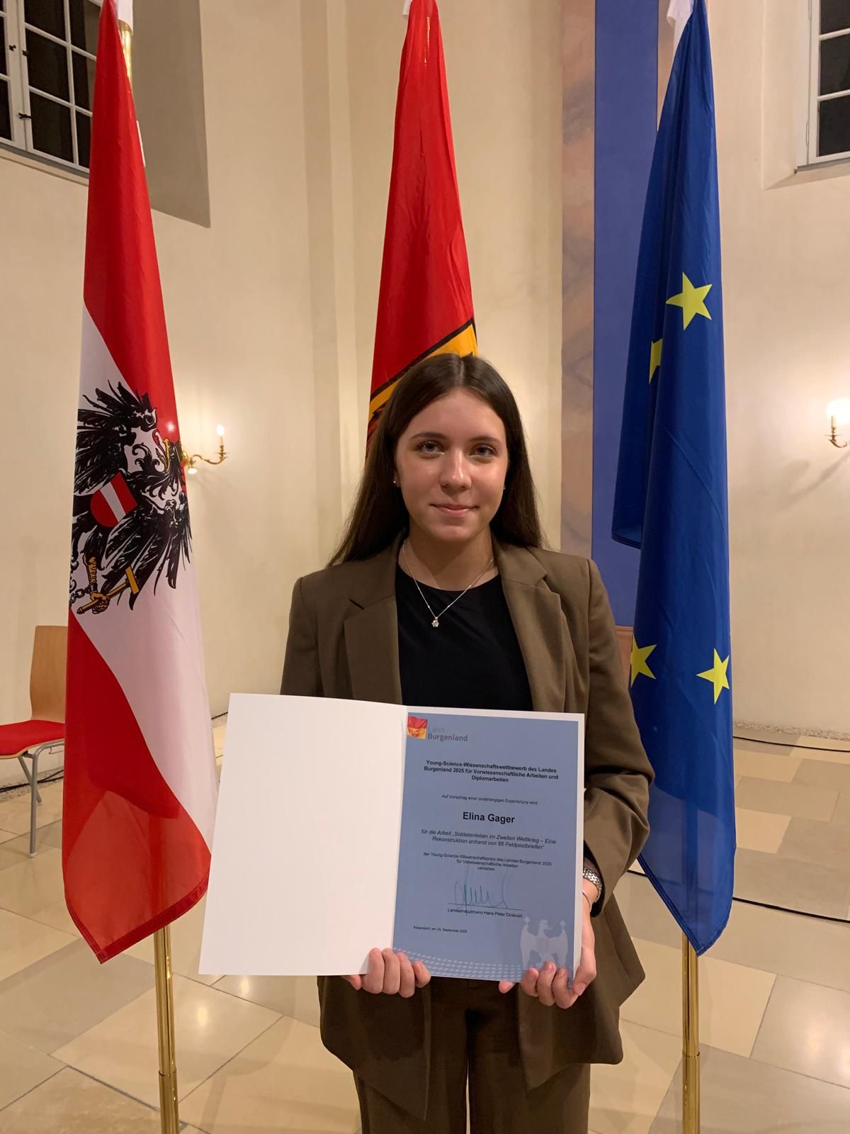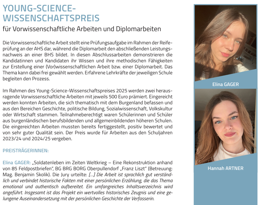 Herbstzeit ist Erntezeit, denn obwohl die Matura schon längst abgeschlossen ist, darf sich eine ehemalige Schülerin des BRGOP besonders freuen. Mit ihrer abschließenden Arbeit „Soldatenleben im Zweiten Weltkrieg – Eine Rekonstruktion anhand von 85 Feldpostbriefen" beschäftigte sich Elina Gager (ehem. 8A) mit dem Leben ihres Urgroßvaters. Neben dem bereits erhaltenen Förderpreis der KPH Wien/Krems für herausragende Abschließende Arbeiten im Bereich Politische Bildung wurde Elinas Leistung ein weiteres Mal gewürdigt. Im Rahmen der Wissenschafts- und Kulturpreisverleihung des Landes Burgenland 2025 wurde Elina in der ehemaligen Synagoge Kobersdorf der Young-Science-Wissenschaftspreis verliehen. Sie darf sich über ein beachtliches Preisgeld in der Höhe von 500€ freuen. Die gesamte Schulgemeinschaft gratuliert dir, liebe Elina, zu diesem großartigen Erfolg und wünscht dir alles Gute für deine Zukunft.